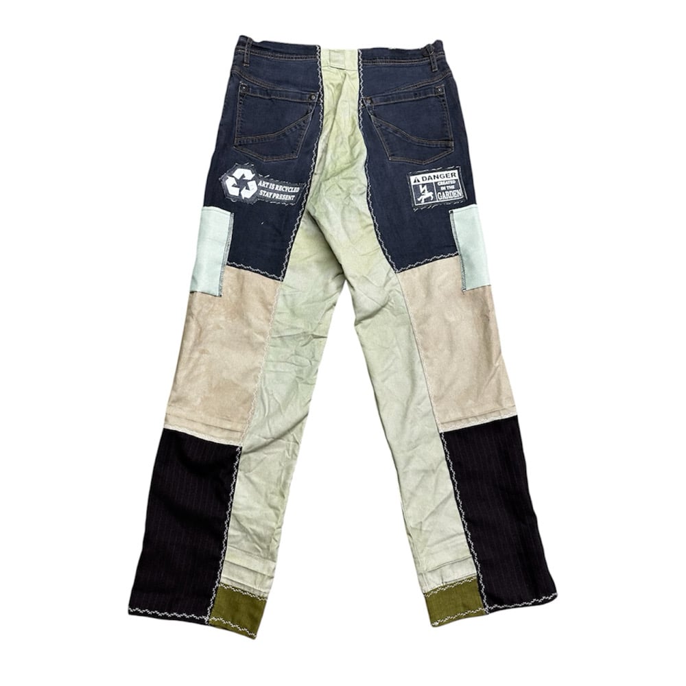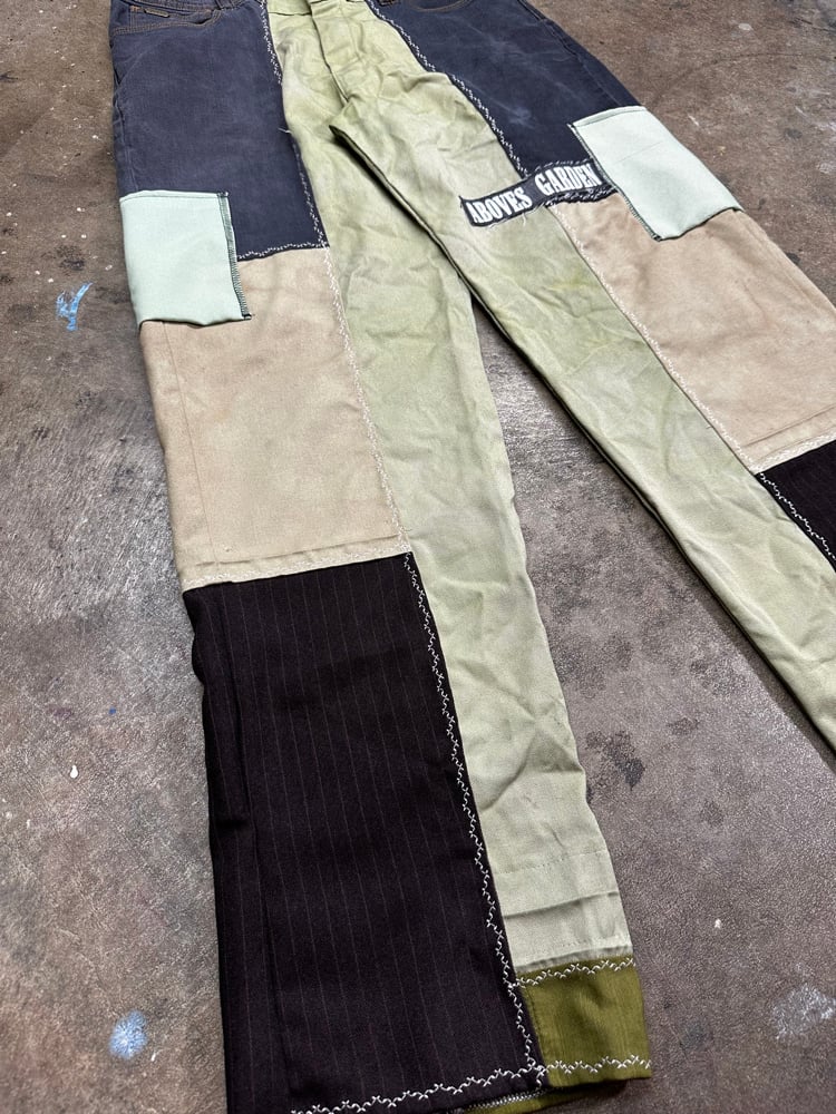 Heavy duty pants cut created with 4 different styles and materials Perfect for any occasion designed with vintage and reused materials for that true 1/1 look with custom patches and signature stitching