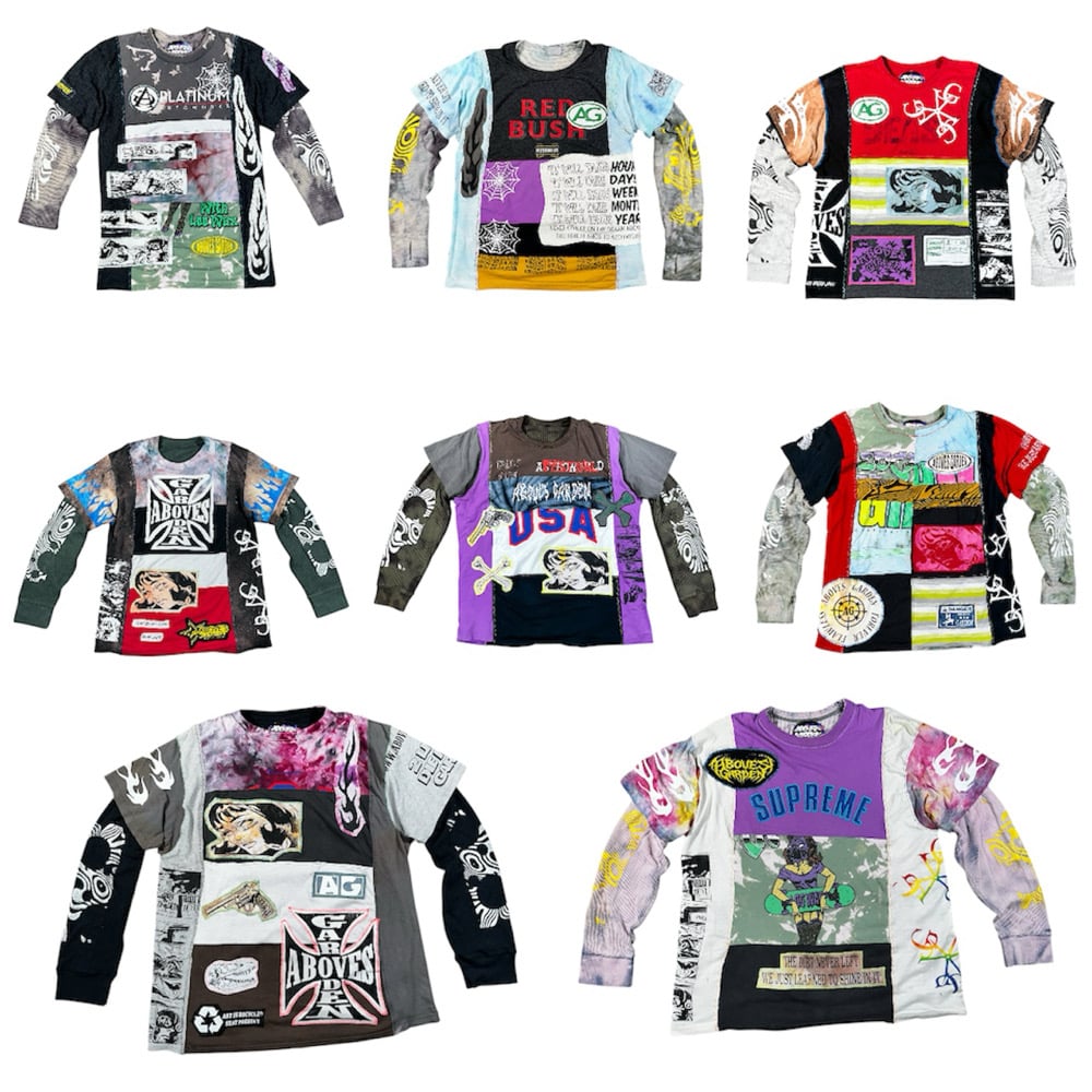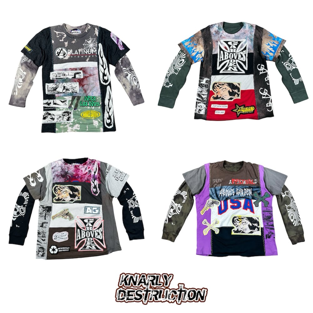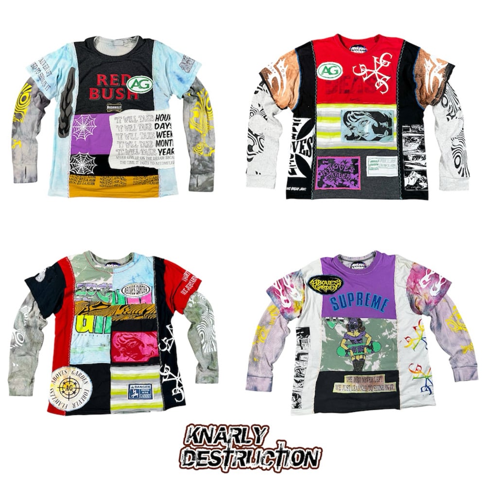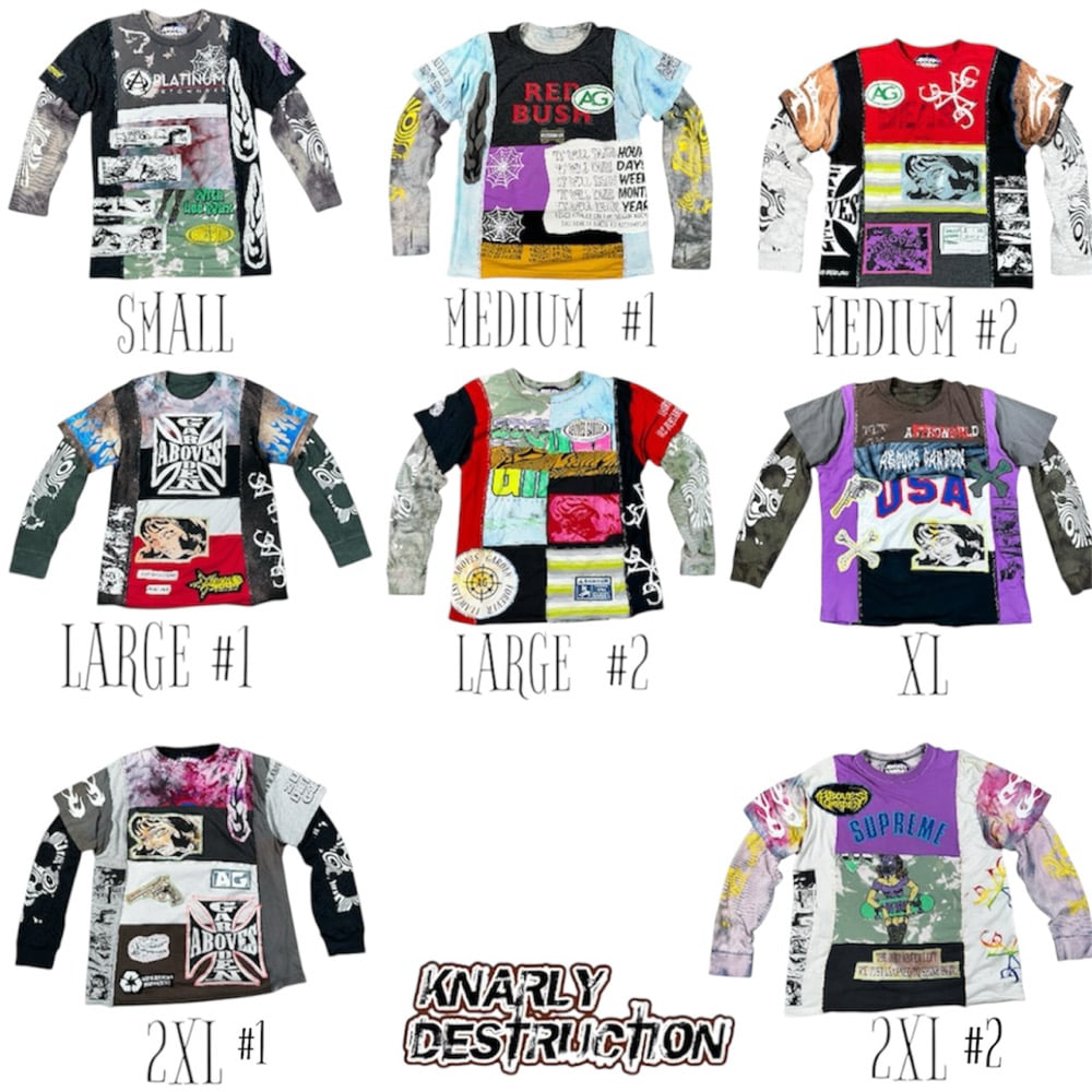 The Knarly Destruction collection is a bold fusion of chaos, craftsmanship, and culture engineered for those who move differently. Each long sleeve shirt is individually constructed from a curated blend of premium cotton panels, archival graphics, custom prints, and layered sleeves, creating a multidimensional piece with its own identity.